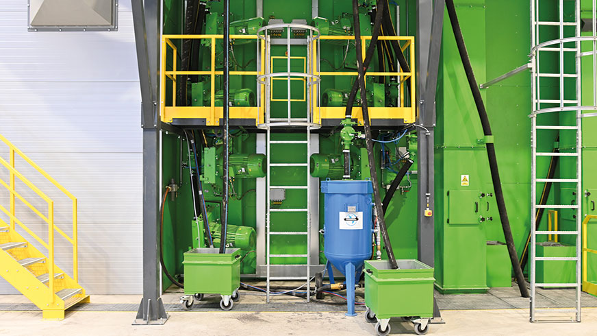 Komora robocza śrutownicy (fot. 7) wyposażona jest w 16 szt. wirników rzutowych o maksymalnej wydajności 380 kg wyrzucanego śrutu/min i mocy 22 kW każdy. Oczyszczanie powierzchni odbywa się w komorze wirnikowej, w której wirniki rzutowe wyrzucają na obrabiane elementy strumień śrutu z dużą energią. Wirniki rzutowe umieszczone są na odpowiednio ukształtowanych bokach komory roboczej, co gwarantuje dokładne i równomierne oczyszczanie wszystkich odsłoniętych powierzchni czyszczonego elementu. W skład zespołu wirników wchodzą także pneumatyczne dozowniki śrutu z mechaniczną regulacją ilości dozowania śrutu, mechaniczne zasuwy (odcinacze) śrutu umiejscowione nad każdym z dozowników, gumowe przewody trudnościeralne i osprzęt niezbędny do transportu śrutu.