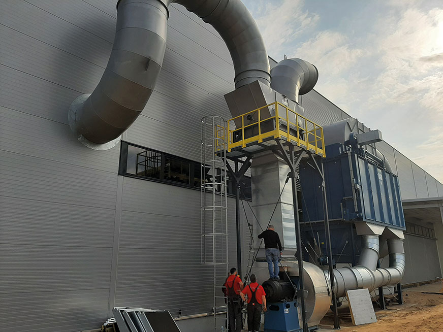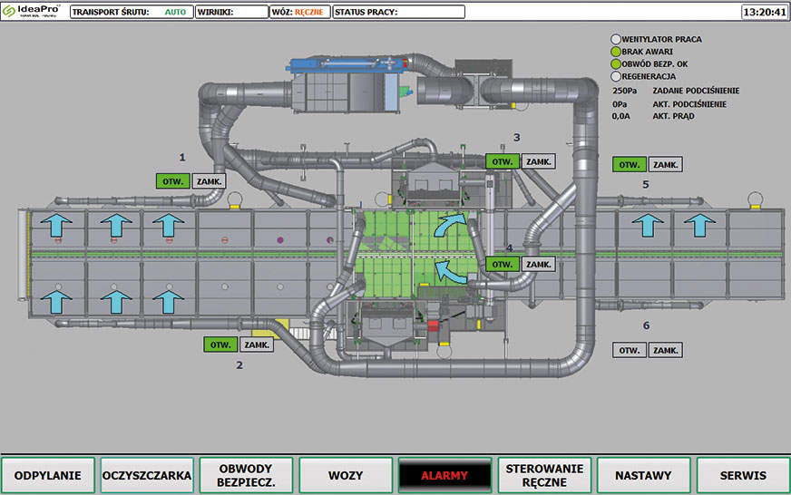 Śrutownica wyposażona jest w filtr zewnętrzny (fot. 8), który w trakcie pracy wytwarza podciśnienie w komorze roboczej, zapobiegając emisji pyłów na zewnątrz. Około 80% oczyszczonego powietrza zawracane jest do komory śrutownicy w celu zachowania bilansu powietrza w hali produkcyjnej. System odpylania i nawiewu jest w pełni zautomatyzowany, podzielony na strefy odpowiadające ruchowi detalu w cyklu automatycznym.