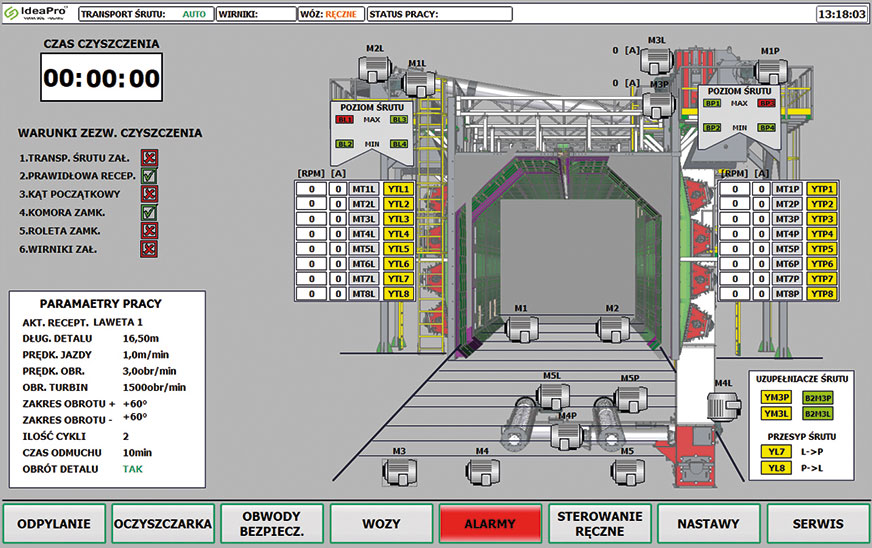 Pulpit szafy sterowniczej wyposażony jest w dotykowy ekran z wizualizacją stanu pracy urządzeń. Umożliwia on także tworzenie bazy receptur z parametrami pracy oczyszczarki dla poszczególnych typów elementów. Tworzenie i edycja receptur chroniona jest hasłami dostępu dla upoważnionego personelu. Operator zobowiązany jest tylko to wybrania i zainicjonowana odpowiedniej receptury zgodnej z oczadzanym elementem. Pulpit umożliwia również definiowanie parametrów procesu dla różnych typów elementów.
