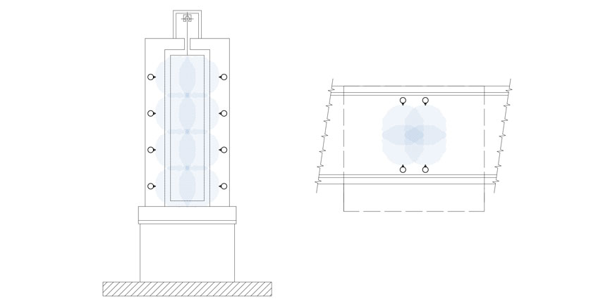 Przykładowa strefa z pasywacją przez nebulizację, czyli natryskiwanie roztworów chemicznych w formie mgiełki (zaznaczona na niebiesko). Po lewej rzut z przodu, po prawej – z góry