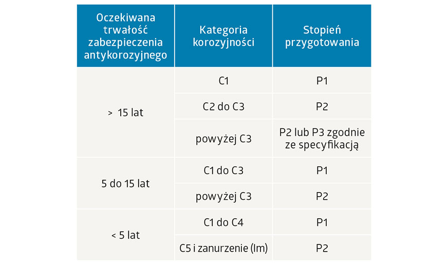 Nieco inny zapis znalazł się w nowym wydaniu normy PN-EN 1090-2/2018 „Wykonanie konstrukcji stalowych i aluminiowych. Wymagania techniczne dotyczące konstrukcji stalowych”. Niestety, w normie PN-EN 1090-2/2018 nie zmieniono okresów trwałości na zgodne z PN-EN ISO 12944-1/2018 i nie uwzględniono kategorii korozyjności CX, więc tabela zależności pomiędzy stopniem przygotowania a kategorią korozyjności wygląda w nowym wydaniu tej normy następująco: