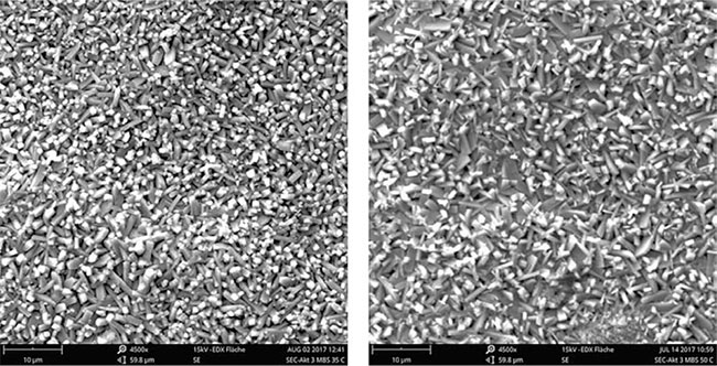 Rys. 2. Po lewej: Stalowa płytka testowa z fosforanowaniem cynkowym LT w temperaturze kąpieli 35°C, po prawej: Stalowa płytka testowa z fosforanowaniem cynkowym LT w temperaturze kąpieli 50°C.