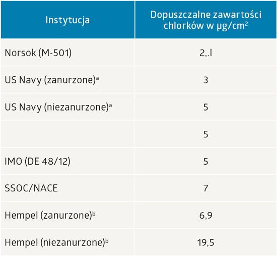Tabela 2. Dopuszczalne poziomy chlorków na stalowych podłożach.