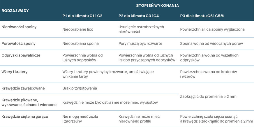 Tabela 1. Wymagania dotyczące obróbki ślusarskiej spawów i powierzchni konstrukcji metalowych zależnie od warunków ich klimatycznych eksploatacji zawartych w normie PN EN ISO 8502 – 3 [1]