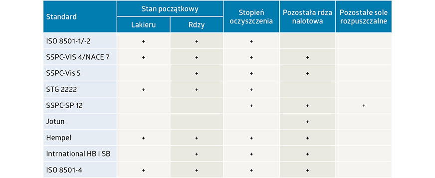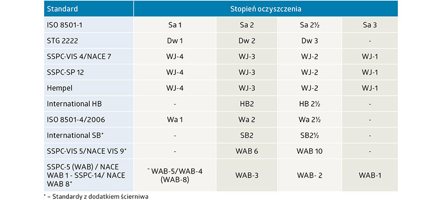 Tabela 2. Zestawienie stopni przygotowania powierzchni standardów mokrego czyszczenia.