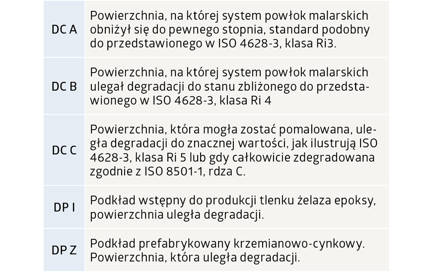 Norma przedstawia dwie początkowe klasy rdzy stali, C i D opisane w normie przygotowania powierzchni ISO 8501-1 oraz standardem przygotowania powierzchni SSPC VIS-1-89 rady ds. malowania konstrukcji stalowych. Definicje są następujące: