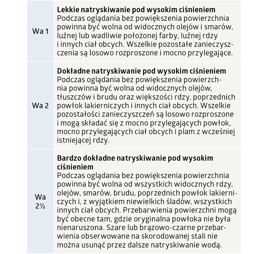 Trzy stopnie oczyszczania oznaczono jako Wa 1, Wa 2 i Wa 2½. Są one zdefiniowane w formie opisu wyglądu powierzchni po oczyszczeniu fotografii wzorcowych (tabela 6).