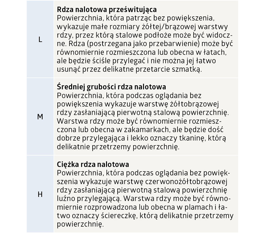 L – lekka rdza nalotowa.Podczas oglądania bez powiększenia niewielkie ilości jasnobrązowej rdzy częściowo odbarwiające oryginalną metaliczną powierzchnię, równomiernie rozmieszczone lub w łatach, ale ściśle przylegające i łatwo oznaczające przedmioty pocierające.