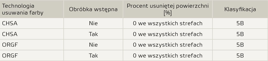 Wyniki badania przyczepności zestawiono w tabeli 8. Nie badano utraty przyczepności w dwóch badanych procesach, z i bez obróbki wstępnej.