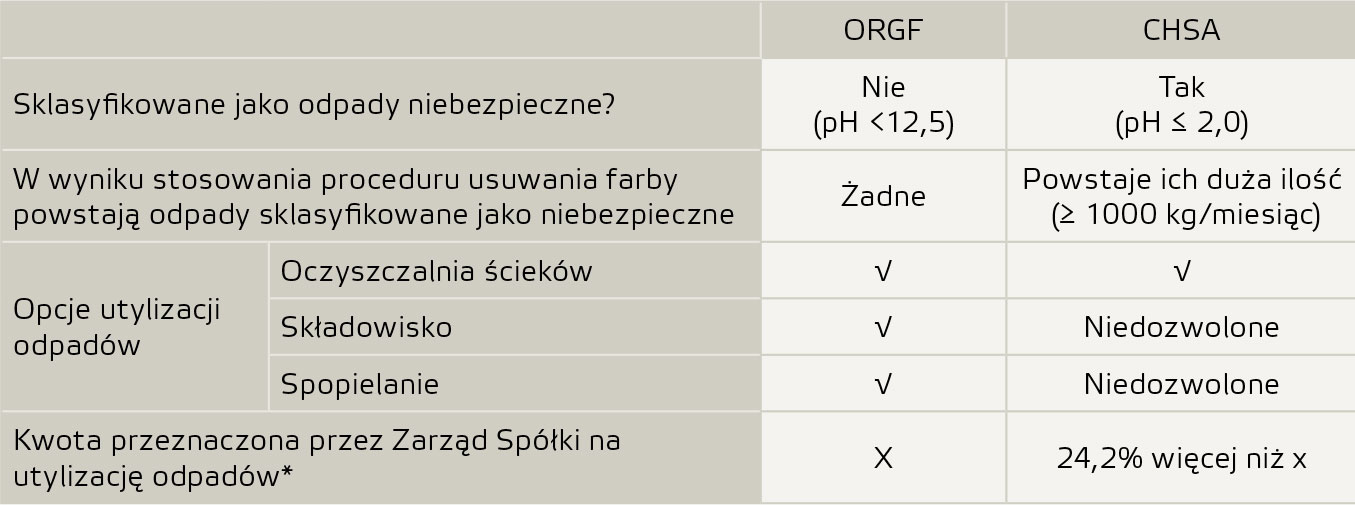 Tabela 9. Postępowania z odpadami i odpadami dla ORGF i CHSA.