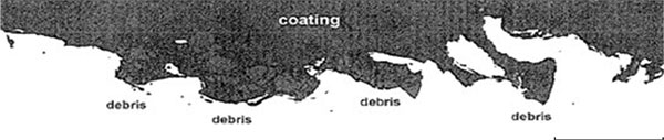 Przekroje powlekanych próbek analizowano za pomocą metody 3 Mombera i Zaata (1960) w celu bezpośredniego oszacowania wpływu na adhezję powłoki do podłoża. Przykład dla tego rodzaju przygotowania próbek pokazano na fotografii 2. Obraz ten dostarcza interesujących informacji o strukturze podłoża obrabianego strumieniowo-ściernie: mocno zdeformowany szczyt przekroju, na którym znajdują się wargi wciąż przyczepione do powierzchni. Widoczna jest również duża liczba odpadów ściernych (żużla pomiedziowego) uwięzionych pod takimi wargami.