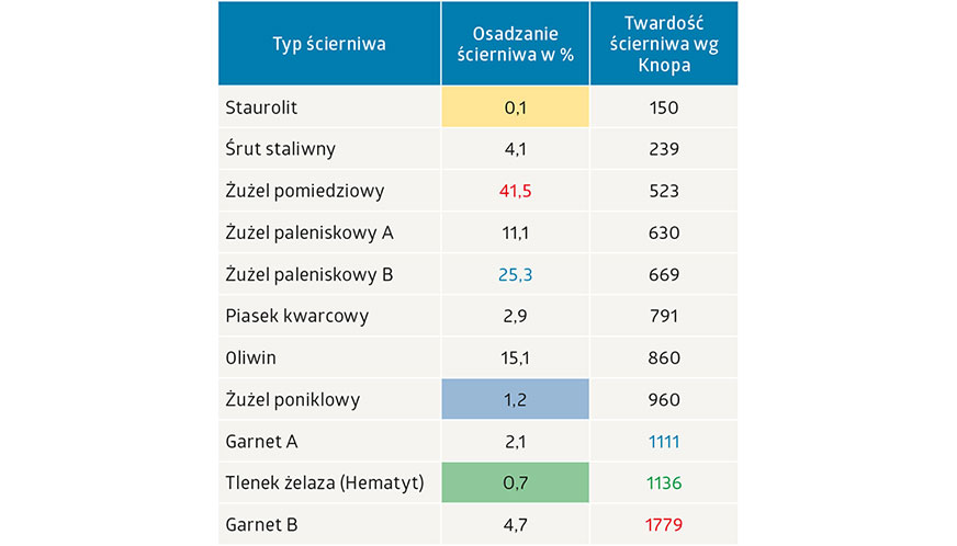 Tabela 5. Osadzanie odpadów ścierniw w stali węglowej. Na czerwono zaznaczono wartości najwyższe, na zielono drugie z kolei, na niebiesko trzecie z kolei. Najlepsze wartości na żółtym tle, drugie najlepsze na zielonym tle, a trzecie na tle niebieskim.
