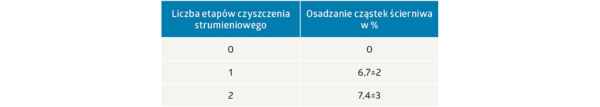Po oczyszczeniu strumieniowo-ściernym próbek stali nierdzewnej ścierniwem korundowym (p = 0,4 MPa) poziom osadzania się resztek wynosił od 7 do 8%. Po oczyszczeniu ultradźwiękowym poziom obniżył się do 5,4%, a po połączeniu z trawieniem i czyszczeniem ultradźwiękowym poziom spadł do 3%.