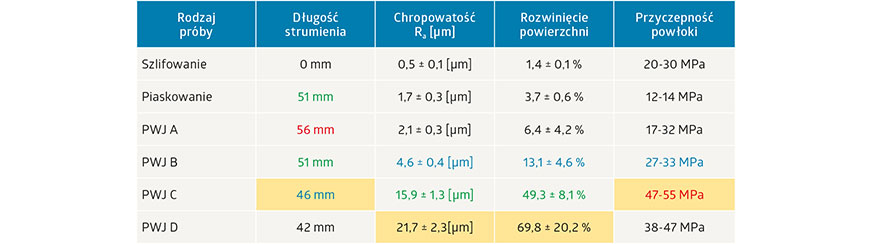 Tabela 7. Wyniki szorstkości dla podłoży polerowanych, piaskowanych i po PWJ. Wartości najwyższe, wartości drugie z kolei, wartości trzecie z kolei. Najlepsze wartości na żółtym tle.