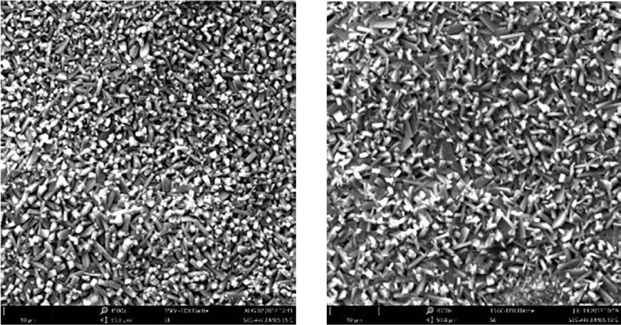 Porównanie SEM fosforanowania cynku w temperaturze 35°C (po lewej) i 50°C (po prawej)