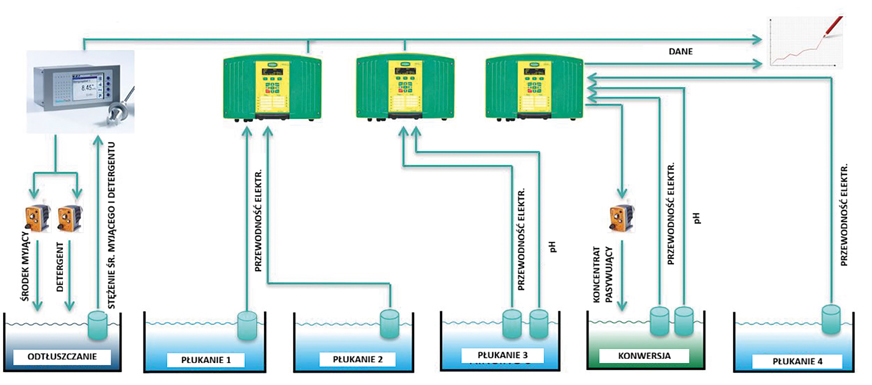 Zastosowanie automatycznej kontroli procesu zapewnia utrzymanie istotnych parametrów procesu na stałym poziomie oraz wibracje systemu wyłącznie w zakresie bardzo niewielkich amplitud koncentracji. Ogranicza to nieproduktywne wykorzystanie, na przykład przyspieszacza, oraz związane z tym koszty. Taki system oferuje również możliwość łączenia procesów: „myśląca” pompa dozująca wysyła sygnał do magazynu chemikaliów, że potrzebny jest nowy pojemnik z określonym składnikiem procesowym. W ten sposób można zoptymalizować procesy łańcucha dostaw i ograniczyć kosztowne dostawy. Na przykład w automatycznym obwodzie sterującym czujnik stale mierzy przewodność elektryczną kąpieli aktywacyjnej i wartość pH. Jeśli zaprogramowana w jednostce sterującej wartość graniczna pH nie zostanie osiągnięta, uruchamia się pompa dozująca, która wprowadza regulator pH bezpośrednio z pojemnika dostawczego do kąpieli. Po osiągnięciu górnej wartości zadanej pompa wyłącza się automatycznie. Centralna jednostka sterująca z ośmioma wejściami dla czujników pomiarowych i ośmioma wyjściami do sterowania pompami dozującymi lub zaworami kosztuje około 4000 euro.
