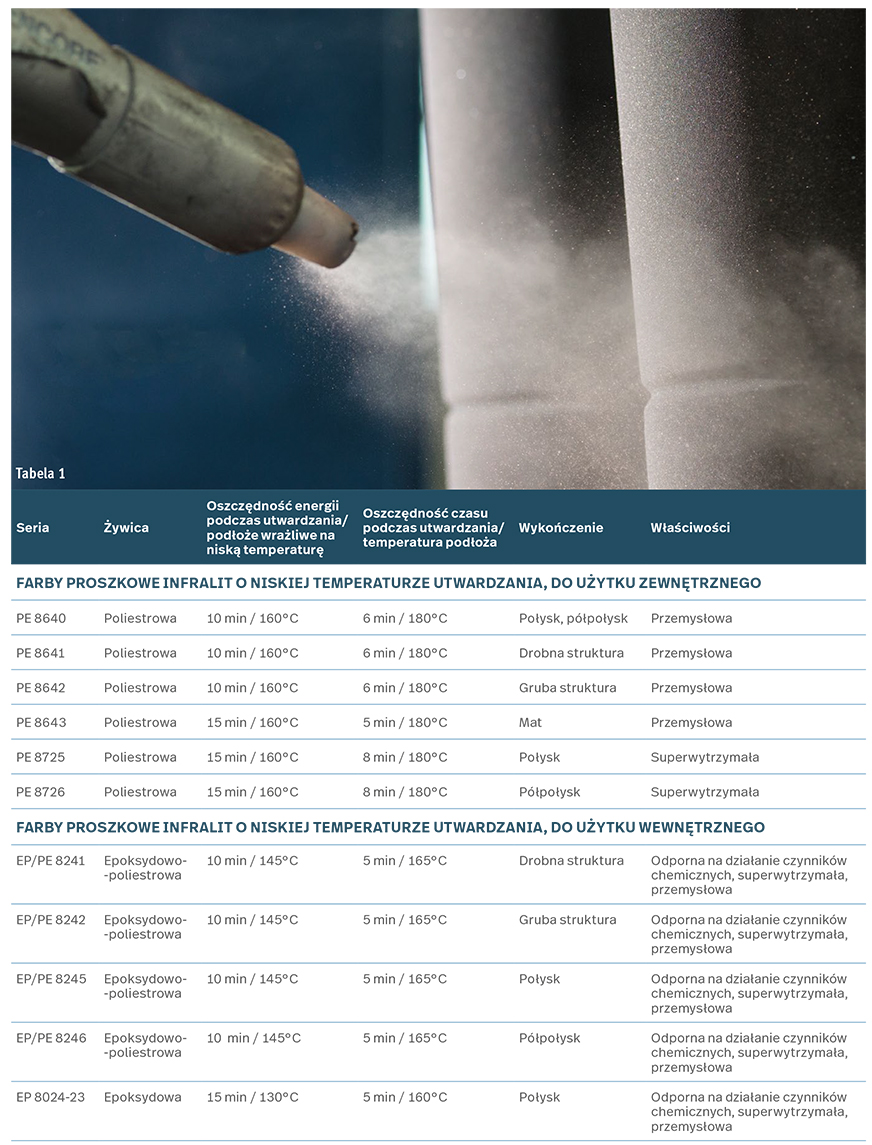 Farby proszkowe INFRALIT o niskiej temperaturze utwardzania polimeryzują się w o wiele niższych temperaturach niż standardowe farby proszkowe, zapewniając wyraźne oszczędności energii. Z drugiej strony, szybkość produkcji przy zachowaniu standardowych temperatur pieca może być zwiększona, dzięki znacznie krótszym czasom obróbki. Szybkość linii może zostać zwiększona bez dostosowywania parametrów przepustowości pieca. Jednocześnie farby proszkowe o niskiej temperaturze utwardzania nie są wrażliwsze na przegrzanie w porównaniu do tradycyjnych farb proszkowych. Dzięki temu są odpowiednie dla wszystkich rodzajów lakierni proszkowych.