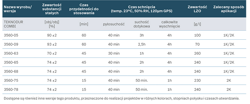 Dostępna jest cała gama poliasparginowych farb serii TEKNODUR COMBI 3560 pozwalająca na dobranie odpowiedniego do potrzeb klienta produktu (tabela 2).