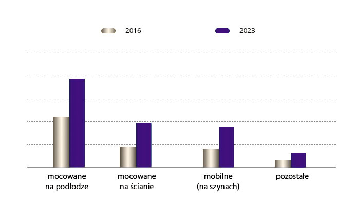 Udział robotów mocowanych na podłodze, ścianie i szynach w ogólnej sprzedaży robotów lakierniczych w roku 2016 i 2023. Źródło: Alied Market Research