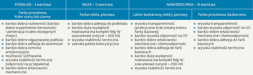 Firmy zajmujące się renowacją felg aluminiowych stawiają coraz większe wymagania w stosunku do powłok lakierniczych stosowanych na koła aluminiowe. Liczy się nie tylko dobry wygląd detalu, ale również wysoka odporność mechaniczna, a także odporność na wpływ czynników środowiskowych (UV, wilgoć, sól czy chemia samochodowa).