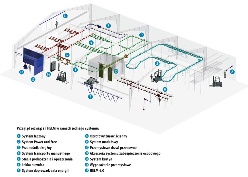 HELM Fördertechnik pracuje w oparciu o inteligentny system modułowy składający się z wysokiej jakości standardowych komponentów, spełniających złożone wymagania technologiczne i warianty montażu. W razie potrzeby możliwe jest indywidualne dostosowanie komponentów pod specyficzne wymagania klienta. Późniejsze adaptacje istniejących systemów, na przykład ze względu na zmiany w procesie produkcyjnym, można wprowadzać szybko i elastycznie: wszystkie elementy systemu można rekonfigurować, częściowo lub w pełni zautomatyzować, a nawet przenieść do nowego zakładu produkcyjnego. System może więc zmieniać się wraz z rozwojem klienta.