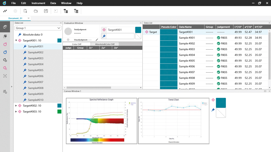 Połączenie z oprogramowaniem do zarządzania kolorami SpectraMagic™ NX25 umożliwia przechowywanie, analizę i komunikację cyfrowych danych dotyczących kolorów przy użyciu standardowych indeksów kolorów. Nowa funkcja szablonów QC pomaga właścicielom projektów kontrolować parametry pomiarów i komunikacji ze współpracownikami i partnerami w łańcuchu dostaw.