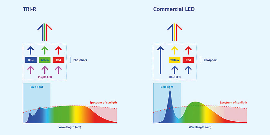 Rysunek 2. Po lewej: dioda LED o pełnym spektrum z trzema fosforami używana w urządzeniach BYK. Po prawej: komercyjna dioda LED o pełnym spektrum z tylko dwoma fosforami