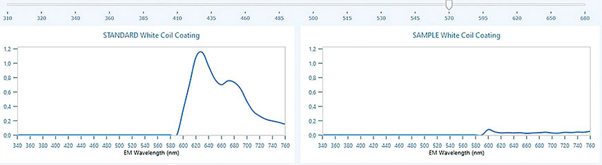 Spektrofotometry umożliwiają kontrolę powtarzalności składu chemicznego materiału pigmentowego przez wskazanie długości fali emisji i natężenia emisji w odpowiedzi na sygnał wzbudzenia. Służy do tego suwak Fluorescence Slider w oprogramowaniu smart-chart (rys. 3). Wędrując suwakiem po kolejnych długościach fal wzbudzenia w zakresie od 310 do 680 nm, odczytujemy na wykresie wzbudzonej emisji (EM) długości fal i natężenia promieniowania fluorescencyjnego.