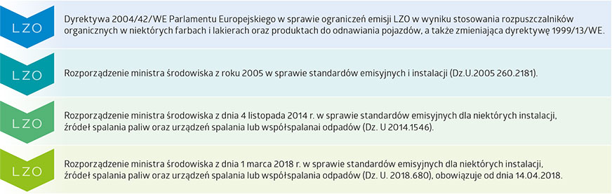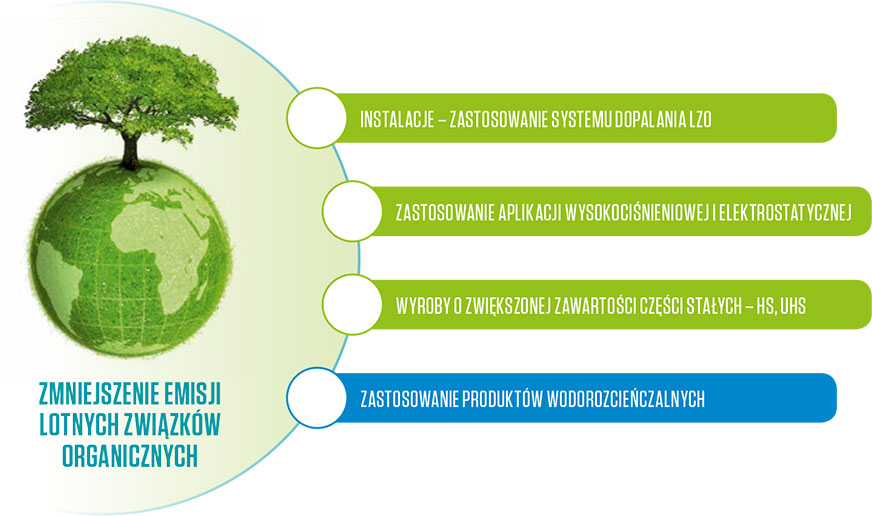 Obecnie dyrektywy europejskie i przepisy polskie w zakresie ograniczania emisji wymuszają na producentach wyrobów lakierowych oraz użytkownikach końcowych zmniejszania zawartości lotnych związków organicznych (LZO). Zarówno producent farb, jak i lakiernia przemysłowa (instalacja) mają obowiązek ustawowy redukcji emisji na poziomie wprowadzanych do obrotu wyrobów oraz utrzymywania LZO w ramach przydzielonych standardów emisyjnych.