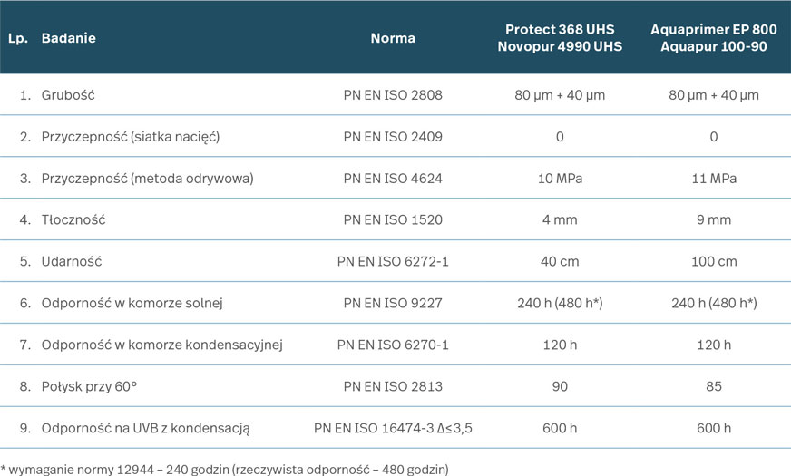 W tabeli znajduje się porównanie systemów EP+PU linii INDUSTRIAL, rozcieńczalnikowego PROTECT 368 UHS + NOVOPUR 4990 z wodnym AQUAPRIMER EP 800 + AQUAPUR 100-90.