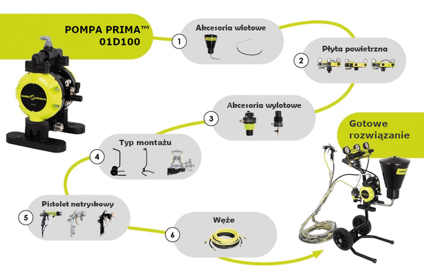 Koncepcja pompy gwarantuje szybkie zasilenie w farbę, ciągłą aplikację bez pulsacji i łatwe płukanie. W połączeniu z ręcznymi pistoletami natryskowymi Airspray i akcesoriami Sames, otrzymuje się idealną kombinację gotowego do pracy zestawu natryskowego. PRIMA 01D100 jest ceniona za swoją niezawodność i łatwość obsługi.