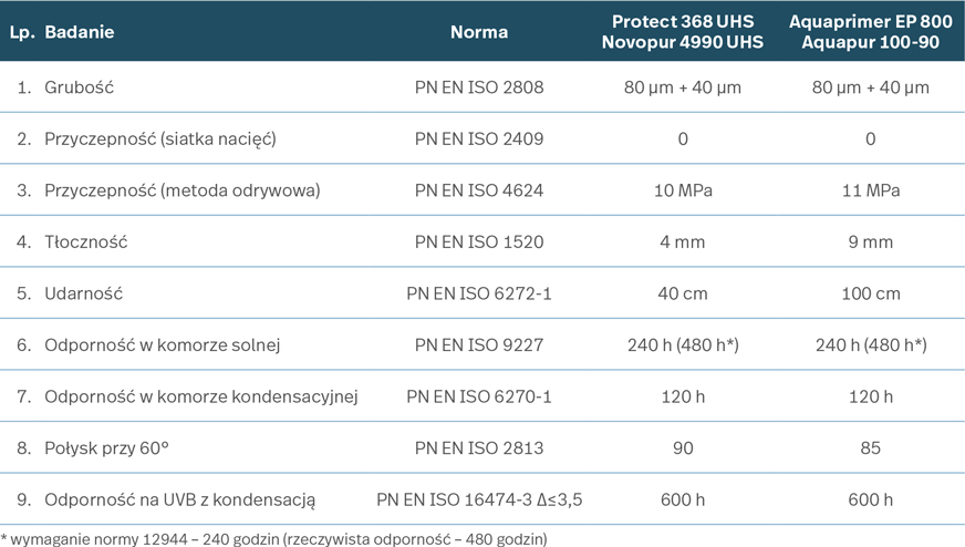 W tabeli przedstawiono porównanie systemów EP+PU linii INDUSTRIAL rozcieńczalnikowego PROTECT 368 UHS + NOVOPUR 4990 z wodnym AQUAPRIMER EP 800 + AQUAPUR 100-90.