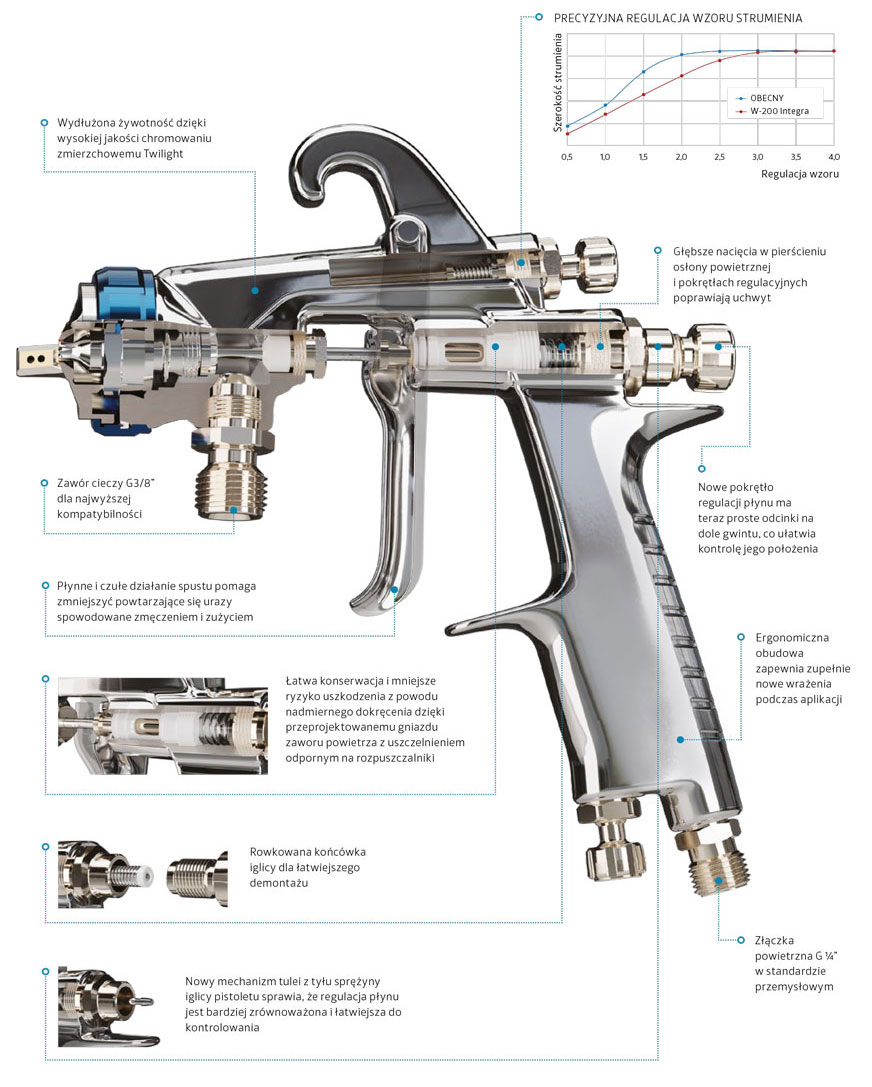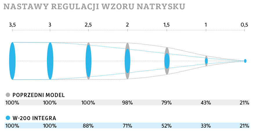 W-200 INTEGRA ma nowy liniowy regulator szerokości strumienia, który zapewnia jeszcze większą i bardziej czułą, stopniową regulację. Ta nowa funkcja pomaga również, gdy wymagana jest precyzyjna adaptacja do warunków w trudno dostępnych miejscach, gdzie szybki, wydajny natrysk punktowy jest wręcz wymagany. Zestaw liniowej regulacji wzoru natrysku zmniejsza się o około 35% przy pierwszym obrocie, 50% po półtora obrotu i 70% po dwóch obrotach, co sprawia, że pistolet jest bardziej responsywny i dostosowuje się do każdych warunków.
