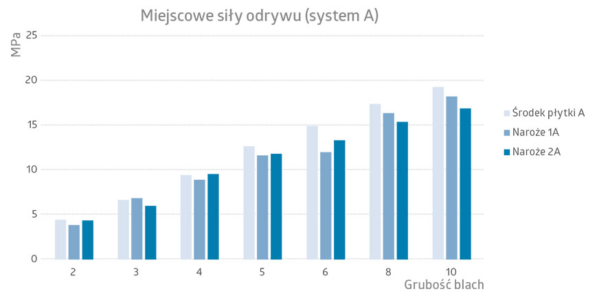 5 MPa)”. Moim zdaniem wymóg wykonywania badań na płytkach o grubości co najmniej 3 mm w połączeniu z wymaganiem przyczepności 2,5 MPa (5 MPa przy oderwaniu od podłoża) stanowi postęp w stosunku do starej wersji normy, chociaż zmiana byłaby jeszcze korzystniejsza, gdyby postawiono wymóg badania odrywowego metodą A (PN–EN ISO 4624/2016) lub do badań odrywowych zalecano by płytki o grubości 10 mm – metoda B. Jak duży wpływ na wynik badania odrywowego (pull off) ma sztywność podłoża – grubość płytek – pisaliśmy już w „Lakiernictwie Przemysłowym” (rys. 1). W poprzedniej wersji normy postawiono jedynie wymóg min. 5 MPa przy oderwaniu od podłoża, co na ogół interpretowano jako minimalny wynik przy badaniu odrywowym bez względu na grubość blach do badań.