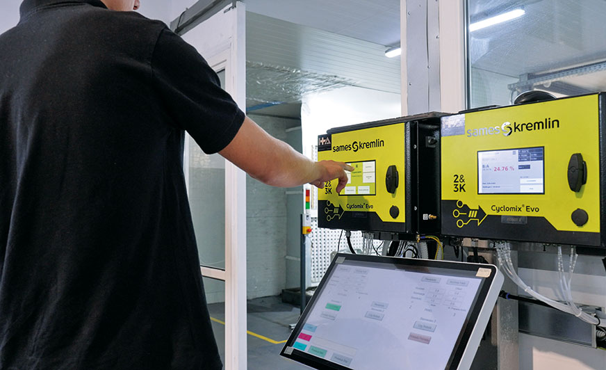 Modułowy dozownik Cyclomix® Evo firmy Sames może być stosowany z farbami rozpuszczalnikowymi lub wodnymi, katalizatorem kwasowym, materiałami PU lub epoksydowymi. Zapewnia on doskonałe dozowanie i mieszanie. Dzięki nowej, opatentowanej metodzie wtrysku technologia Spraymix umożliwia wstępne mieszanie w punkcie wtrysku.