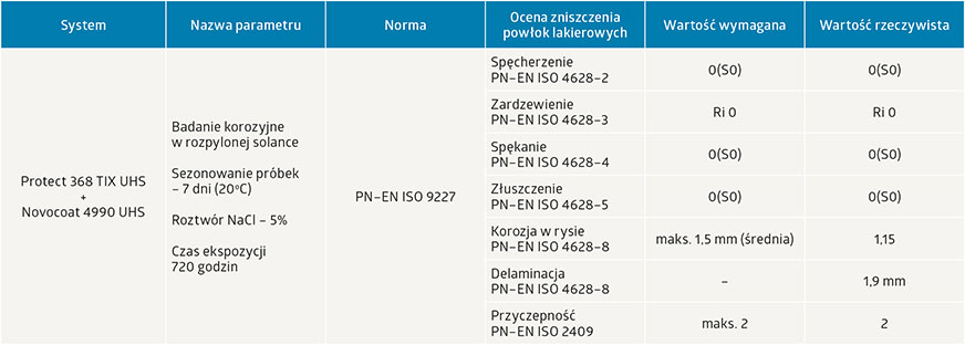 Czas ekspozycji (klasa korozyjności/okres trwałości: C4M) wg normy PN–EN ISO 12944–6 dla określonych grubości systemu 180 µm, składającego się z: 120 µm Protect 368 TIX UHS (podkład epoksydowy) + 60 µm Novocoat 4990 UHS (emalia akrylowa) powinien wynosić 480 godzin (świadomie dwukrotnie zwiększyliśmy czas badania próbek).