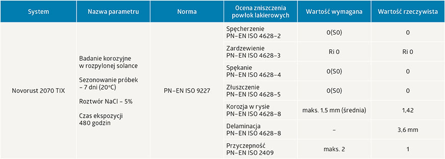Czas ekspozycji (klasa korozyjności/okres trwałości: C4L) wg normy PN–EN ISO 12944–6 dla określonej grubości systemu 160 µm, składającego się z Novorust 2070 TIX (gruntoemalia poliuretanowa) powinien wynosić 240 godzin (świadomie dwukrotnie zwiększyliśmy czas badania próbek).