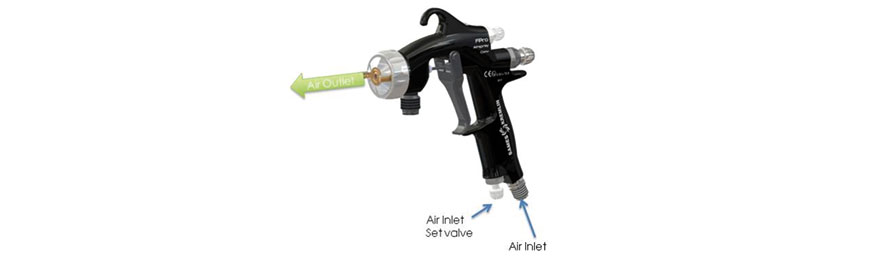 Regulacja ciśnienia powietrza jest niezwykle ważna. Jeśli nie masz regulatora w podstawie pistoletu, możesz użyć zaworu przepływowego w podstawie rękojeści. Masz wybór pomiędzy różnymi głowicami powietrznymi. Dwa najważniejsze kryteria przy wyborze głowicy, to przeznaczenie (okrągły strumień, płaski strumień, specjalny do kleju itd.) i maksymalna szerokość strumienia (uzyskana na końcu może być różna). Szerokość strumienia uzyskana na końcu zawsze może być zmniejszona dzięki zaworowi na pistolecie, ale nigdy nie będzie większa niż maksymalna szerokość strumienia podana w arkuszach danych SAMES KREMLIN. Aby uzyskać najwyższą jakość rozpylania, radzimy nie przekręcać zaworu nastawczego zbyt mocno (nie zmniejszaj szerokości strumienia o więcej niż 50%), ponieważ pogorszy się równowaga w szerokości, chyba że przekręcisz zawór nastawczy całkowicie, aby uzyskać okrągły, idealnie wyważony strumień. Po wybraniu głowicy powietrznej należy ustawić ciśnienie powietrza na rękojeści pistoletu. Ogólnie zalecamy (przy całkowicie otwartym zaworze nastawczym) dla HVLP i LVLP: 2,0 do 2,5 bara na rękojeści.