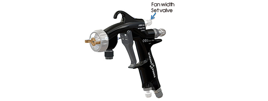 - Po ustawieniu ciśnienia powietrza atomizującego ostatnim ustawieniem jest szerokość strumienia. Dzięki zaworowi nastawczemu można zmniejszyć szerokość strumienia.