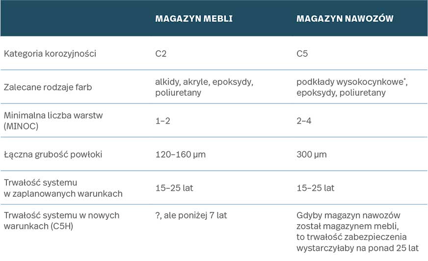Z długą trwałością związana jest jeszcze jedna, wcale nierzadka, sprawa. Większość inwestorów planuje swoje obiekty na lata i na ogół zakłada, że będą w nich prowadzili tę samą lub podobną działalność. Życie dość często weryfikuje te plany. Rolnik, który postawił oborę, przerabia ją na pieczarkarnię, właściciel salonu meblowego sprzedaje halę, w której miał magazyn, hurtowni nawozów sztucznych itd. Pomieszczenia są adaptowane na nowe potrzeby najczęściej minimalnym kosztem. Konstrukcja, której zabezpieczenie zaprojektowano na kategorię korozyjności C2 (ogrzewany magazyn mebli), zostaje narażona na środowisko C5 (nieogrzewany magazyn nawozów sztucznych). To najczęściej kończy się szybkim uszkodzeniem dotychczasowego zabezpieczenia. Dlaczego? W tabeli porównujemy systemy malarskie, jakie powinny być w tych pomieszczeniach (przyjęto trwałość długą dla obu przypadków).