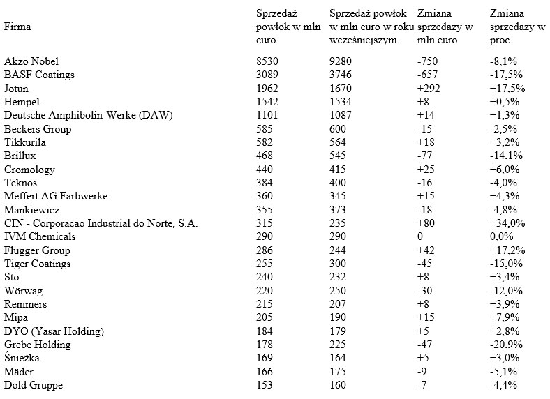 Magazyn „European Coatings”, jak co roku, opublikował ranking największych europejskich producentów powłok. Czołowe pozycje pozostały bez zmian, ale niemal cała branża odnotowała znaczne spadki sprzedaży.
