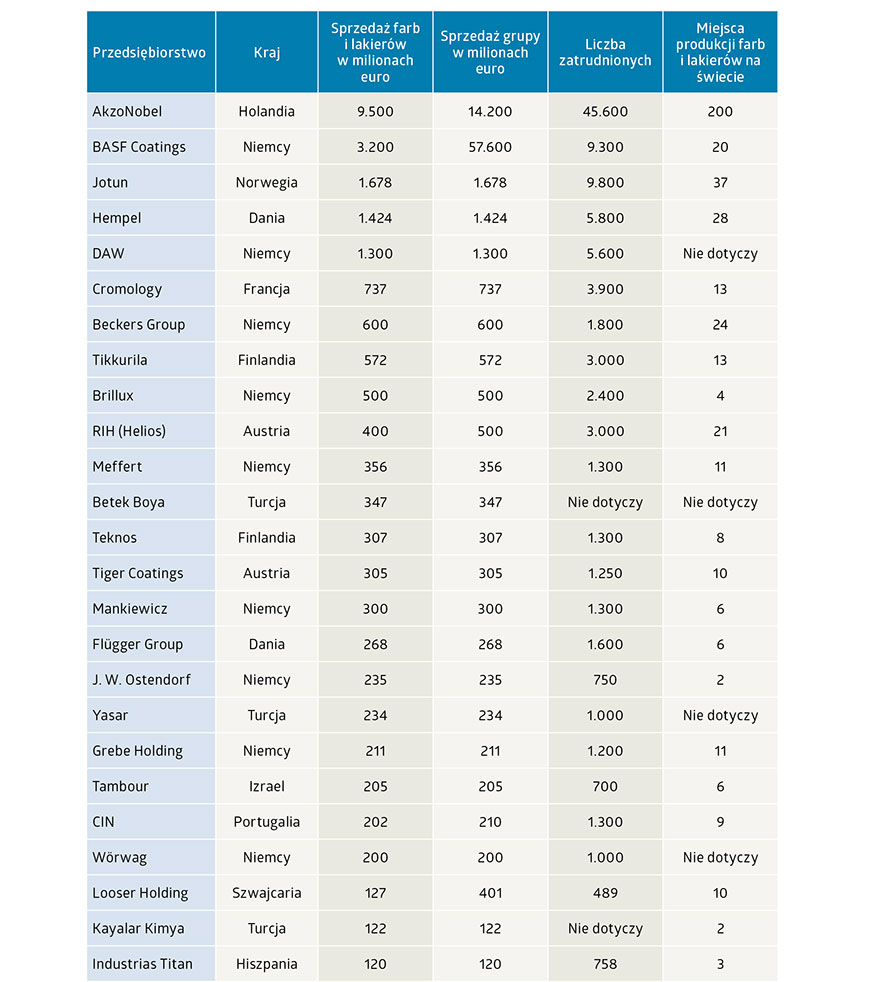 Czasopismo „Europen Coatings” ogłosiło doroczny raport 25 największych producentów farb i lakierów, którzy mają swoją siedzibę w Europie. Pierwszoplanowym graczem na rynku europejskim pozostaje holenderski AkzoNobel.