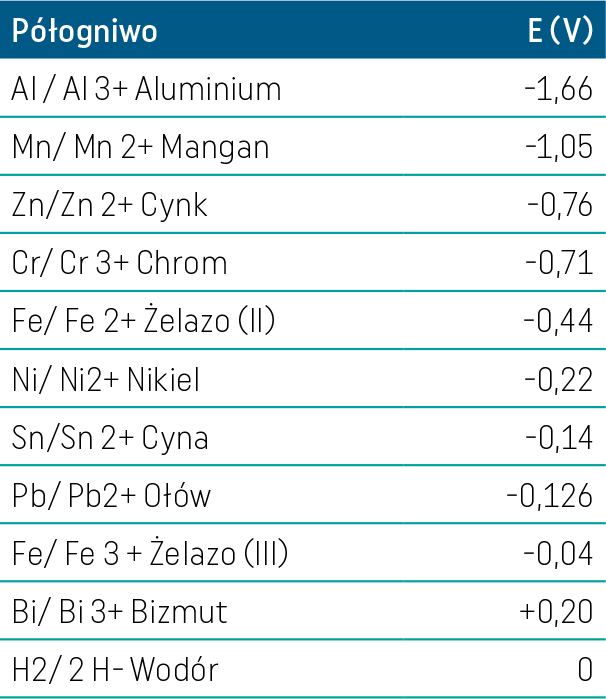 Tabela 1. Tabela potencjałów E (V) dla wybranych metali (Źródło: „Poradnik galwanotechnika”, praca zbiorowa, WNT, 2002)