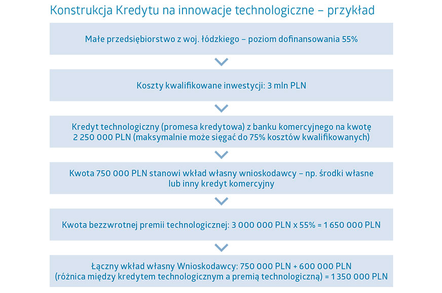 Odnotujmy tutaj, że łączna wartość wydatków, o których mowa w punktach 1 i 5, nie może przekroczyć 10% łącznej wartości wydatków kwalifikowalnych. Natomiast względem wydatków wskazanych w punkcie 6 dofinansowanie może wynieść 50% ich wartości – w tym przypadku nie ma znaczenia wielkość firmy, jak i lokalizacja projektu. Należy także pamiętać, że sam kredyt technologiczny jest limitowany do 75% wysokości kosztów kwalifikowanych. Na grafice 3 przedstawiono przykład wyliczania premii technologicznej.