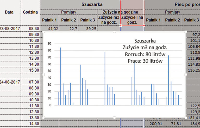Rys. 2. Wykres danych cząstkowych – pomiar zużycia mediów w jednostce czasu.