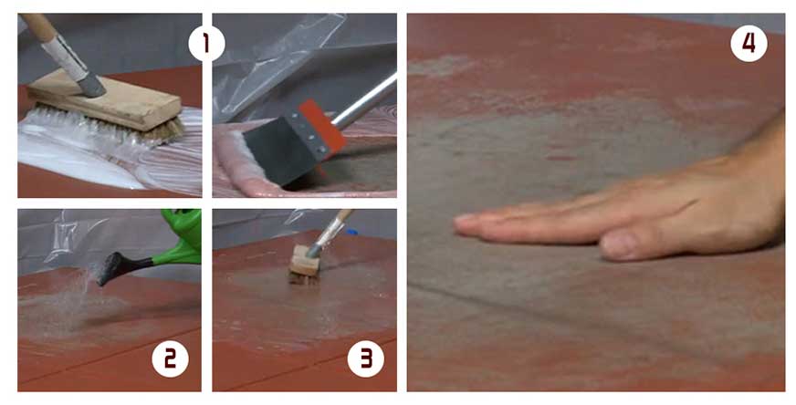 Bezpośrednio przed nałożeniem podkładu beton warto także wytrawić. Wytrawiacz można nałożyć na wilgotną powierzchnię, usuwając wcześniej nadmiar wody, ale najlepsze efekty przyniesie, jeśli poczekamy, aż posadzka całkowicie wyschnie. Aby dokładnie go rozprowadzić, najlepiej użyć konewki i szczotki ze sztywnym włosiem. Produkt należy pozostawić na posadzce na 10-20 minut, a następnie energicznie wyszorować całą powierzchnię.
